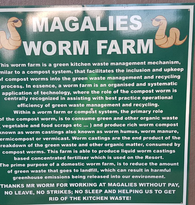 Magalies Park introduced a plant nursery. Seeds harvested from mature plants are nurtured into seedlings and later transplanted back into the grounds, enriching its greenery with home-grown plants. The resort uses indigenous plants and recycles all garden waste into compost, including hyacinths from the waterfront, enhancing the nutrients and health of the garden.